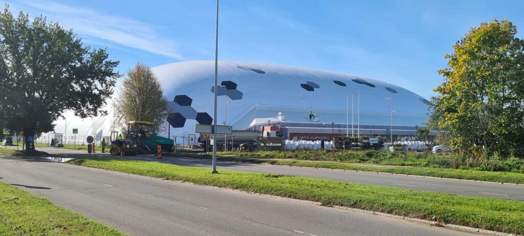 Пневматический спортивный холл в Нарве, похожий на прильнувший к земле огромный дирижабль, строители намереваются сдать под ключ к 25 октября.