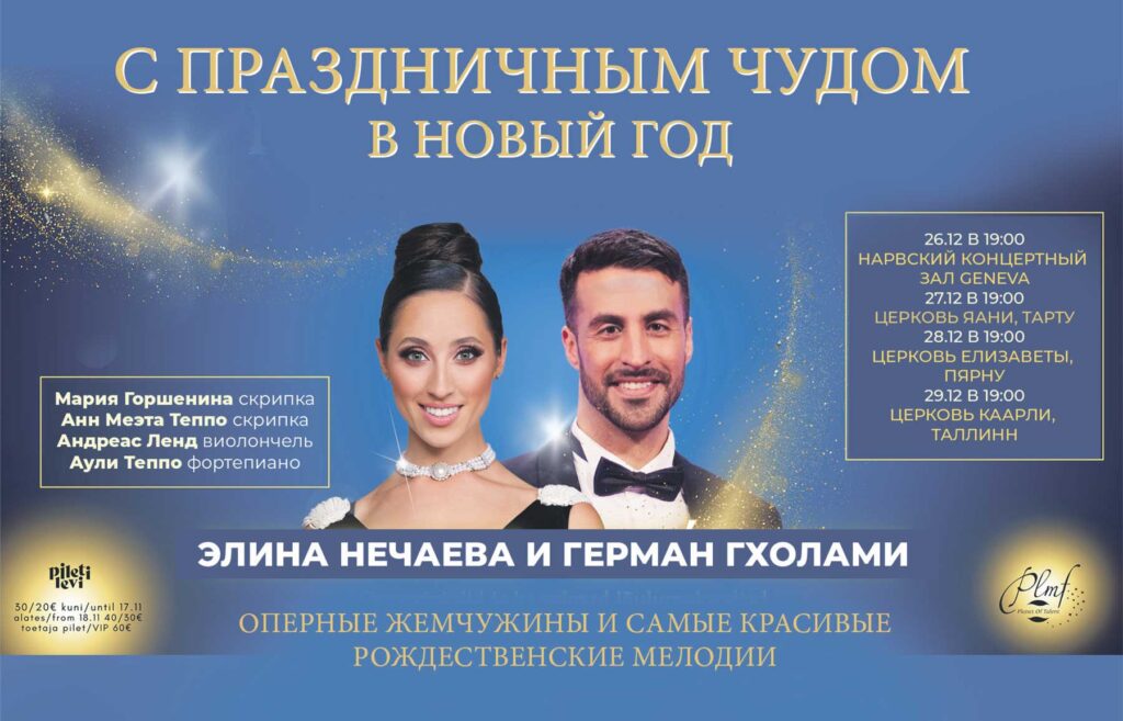 В этом новогоднем сезоне звезды сцены Элина Нечаева и Герман Гхолами порадуют публику яркими концертами по всей Эстонии!