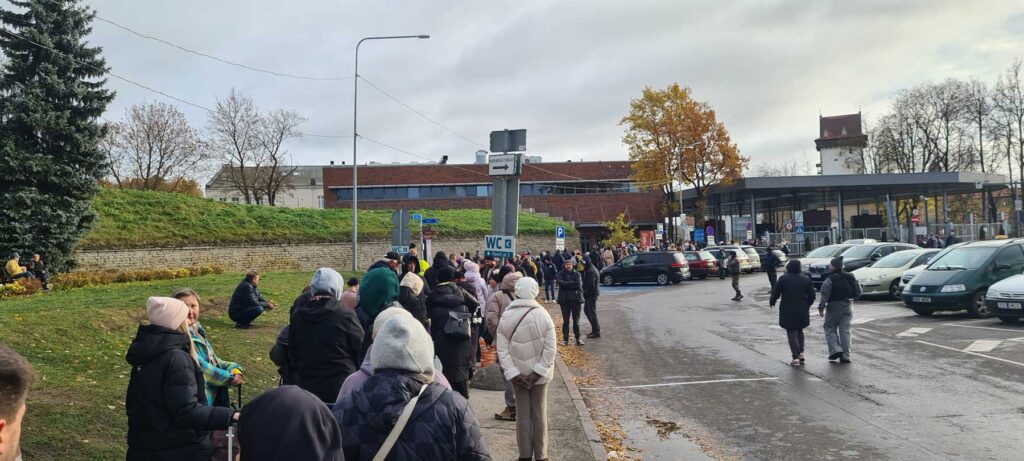 Холодновато, хотя дождя нет, и со временем начинают подмерзать ноги. Прогуливаясь вдоль очереди, чтобы согрелись ноги, несколько раз услышал эстонскую речь — в Россию, стало быть, зачем-то направляются и эстонцы.