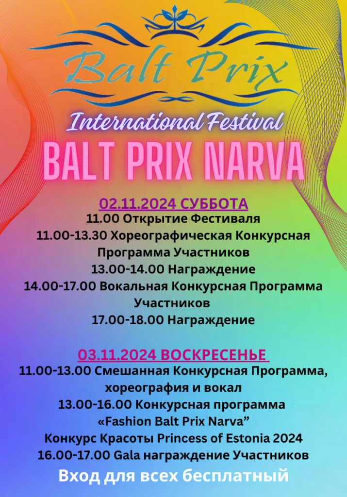 ЧТО? Balt Prix Narva — International Festival. Смешанная конкурсная программа участников, хореография и вокал. Награждение. Конкурс красоты Princess of Estonia 2024. Вход бесплатный.