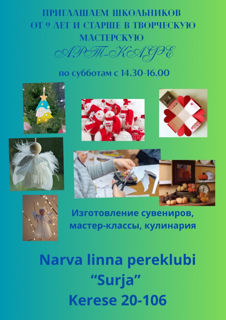 ЧТО? В программе различные мастер-классы, кулинария, изготовление сувениров, мягкая игрушка, шитье. Каждый ребенок может сделать своими руками подарок или украшение для своей комнаты в любой технике. Все материалы предоставляются. Абонемент 40 евро в месяц.