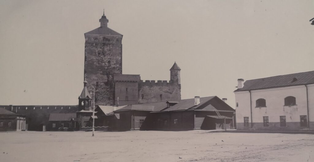 Первая остановка была на территории Большого Западного двора Нарвского замка, где с 1859 года располагалась деревянная церковь. Ее основали по инициативе расквартированного в то время в Нарве Санкт-Петербургского гренадерского полка. Храм предназначался для военных и был освящен во имя св. Александра Невского. Во время войны в 1944 году церковь разрушили, но в ходе реконструкции Большого Западного двора был обнаружен ее фундамент.