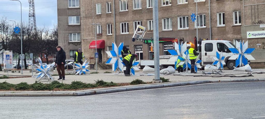 А посередине обновленного главного кольца Нарвы деловитые работники под неусыпным контролем городского художника Дениса Гиренко монтируют красочные конструкции в виде огромных снежинок.