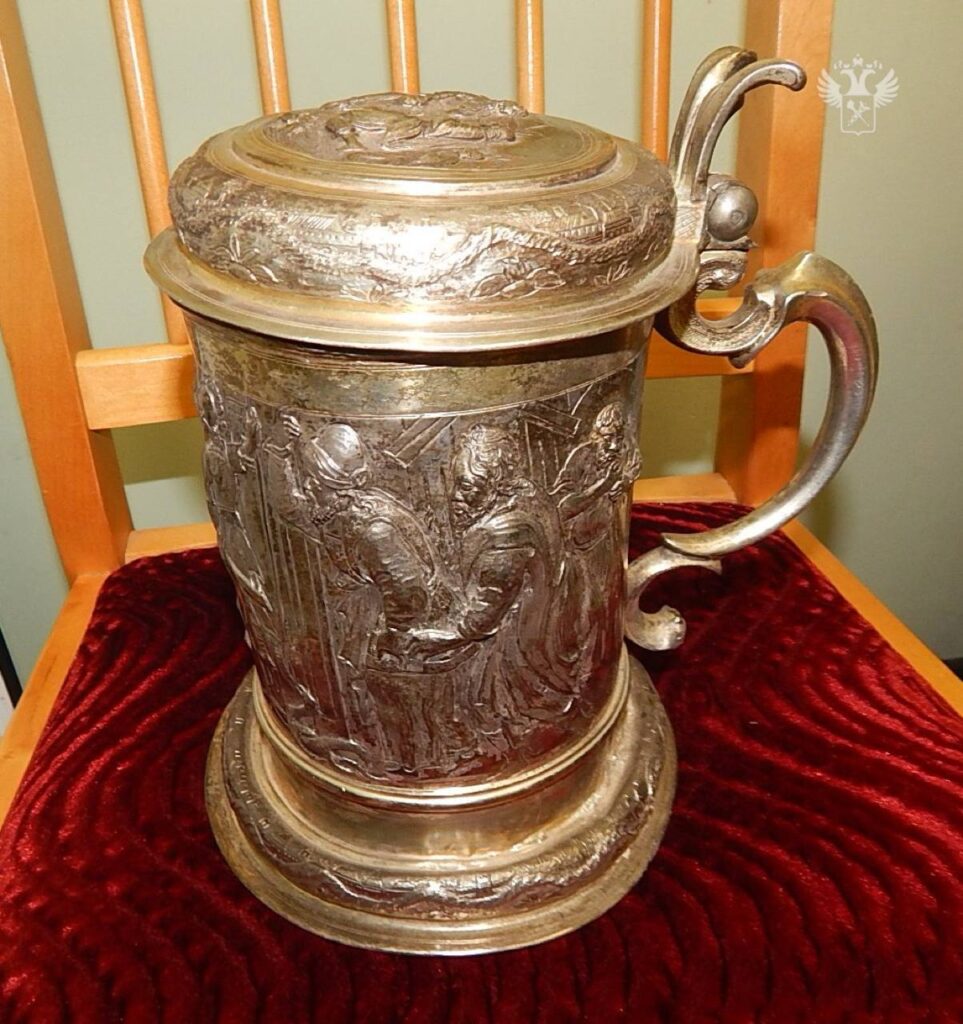 Специалисты установили, что кружка изготовлена в Германии и украшена библейскими сюжетами. На крышке изображены мотивы из «Притчи о блудном сыне» из Евангелия от Луки, а сам предмет оформлен в традиционном стиле с растительным орнаментом. Эксперты оценили его стоимость в 374 тысячи рублей.
