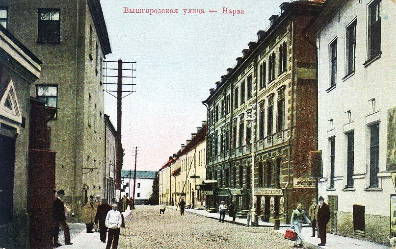 Главная улица Нарвы – Вышгородская – как и все улицы старинной части города, узкая, застроенная зданиями шведских времен. В конце её четырехгранная небольшая площадь в окружении монументальных, интересных по своей архитектуре исторических строений, а среди них старинная ратуша, строительство которой началось в 1663 году и закончилось в 1671 году по проекту шведского архитектора Георга Тейфеля. С правой стороны ратуши здание биржи, с левой – важня. Рядом частновладельческие дома, в том числе старая аптека, на стене которой с южной стороны устроены солнечные часы.