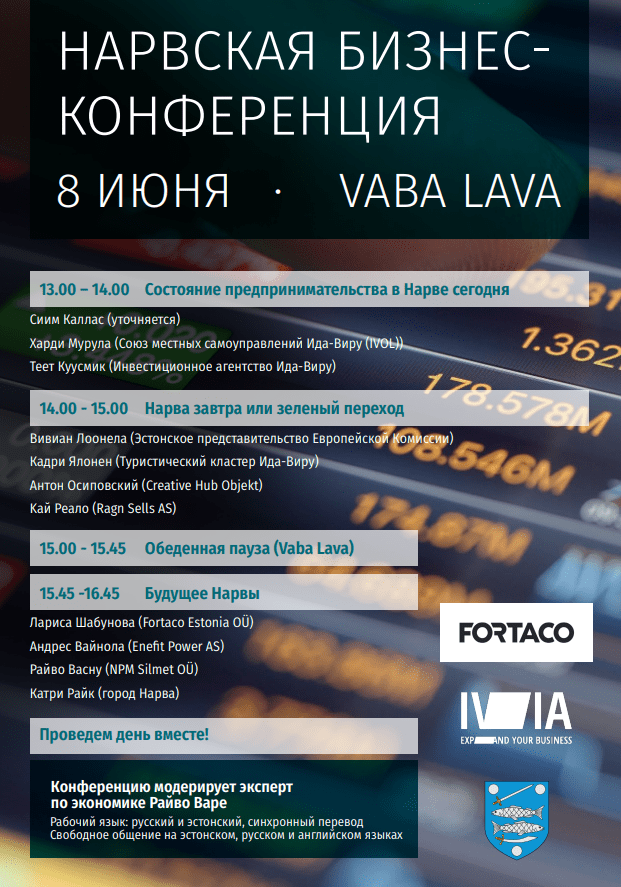 Конференцию модерирует финансовый эксперт Райво Варе. Мероприятие проходит при поддержке Fortaco Estonia OÜ и Инвестиционного агентства Ида-Вирумаа.