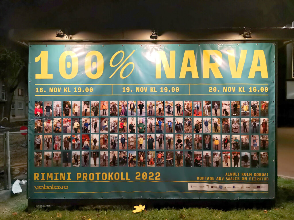 У театрального центра Vaba Lava Narva на Линда, 2 стоит афиша предстоящего спектакля «100% Нарва», где можно увидеть фотографии всех 100 нарвитян, которые в нем участвуют.