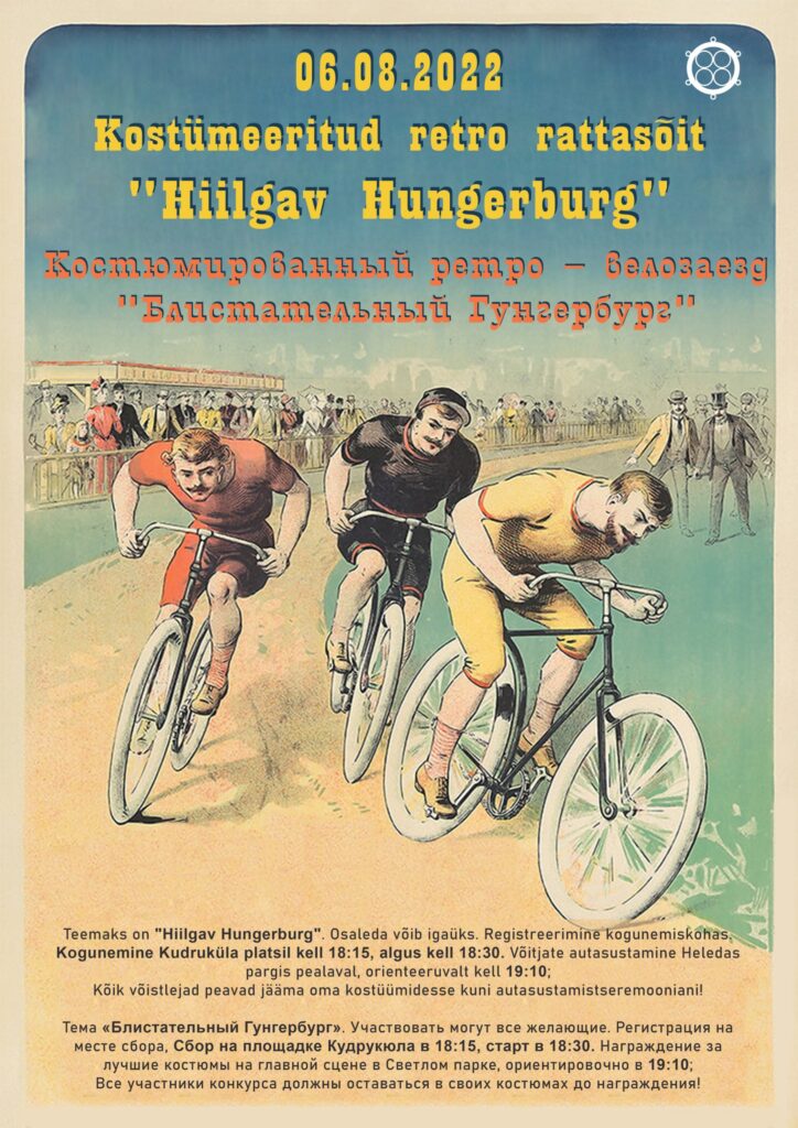 18:00 – Костюмированный ретро – велозаезд. Тема «Блистательный Гунгербург». Участвовать могут все желающие. Регистрация на месте сбора, Сбор на площадке Кудрукюла в 18:15, старт в 18:30. Награждение за лучшие костюмы на главной сцене в Светлом пар- ке, ориентировочно в 19:10; Все участники конкурса должны оставаться в своих костюмах до награждения!