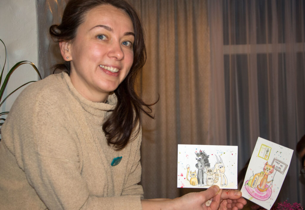 Ольга Шнайдер с рисунками, нарисованными на на встрече в Valge Kõrvits.