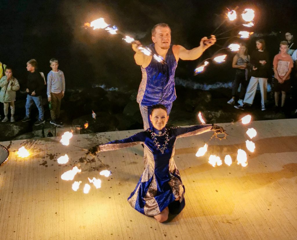 Егор и Елена занимаются фаер-шоу уже 10 лет. Начинали они в Тарту, в коллективе Zerkala, но в 2015 г. переехали в Таллинн и стали выступать вдвоём, в семейном тандеме. Как рассказал Егор, идеи программ чаще возникают у Елены, а он уже старается воплотить их в жизнь. «Огонь требует уважения к себе, – говорит Егор, – нельзя пришедшую идею сразу пробовать с огнём – сначала обязательно делаем отработку без огня, это минимум 10 часов на один танец под одну музыку». В программе артистов было несколько номеров – зрители очень ждали выступления группы и громко поддерживали дуэт аплодисментами.