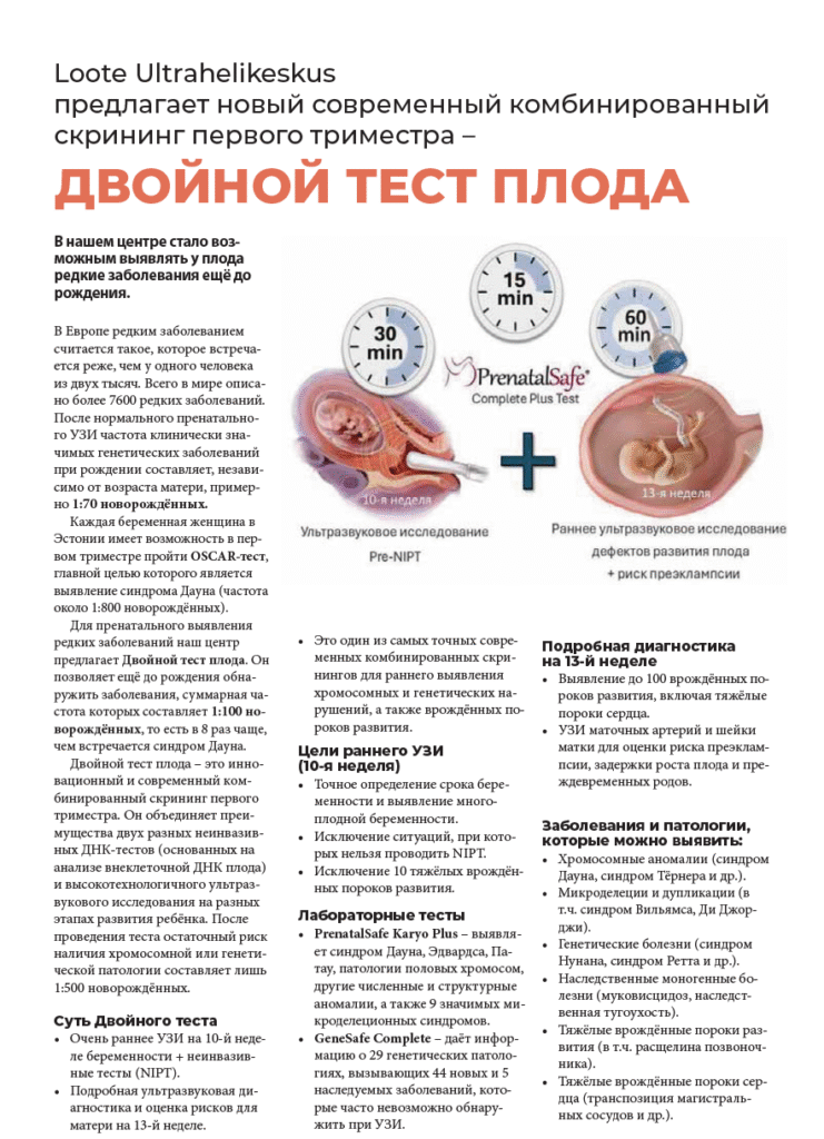 Для пренатального выявления редких заболеваний наш центр предлагает Двойной тест плода. Он позволяет ещё до рождения обнаружить заболевания, суммарная частота которых составляет 1:100 новорождённых, то есть в 8 раз чаще, чем встречается синдром Дауна.