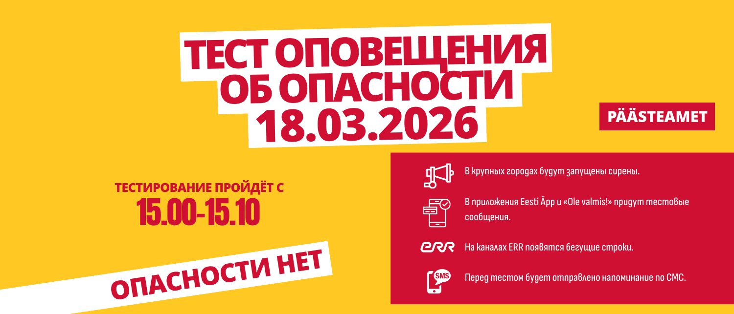 В среду, 18 марта, Спасательный департамент совместно с партнёрами проведёт проверку работы единой системы оповещения об опасности — EE-ALARM. В период с 15:00 до 15:10 по всей стране будет запущена сеть сирен с реальным сигналом тревоги, сообщает департамент. Информация о тестировании также будет передана через мобильные приложения Eesti äpp и «Ole valmis!», а также через каналы Эстонского национального телерадиовещания.