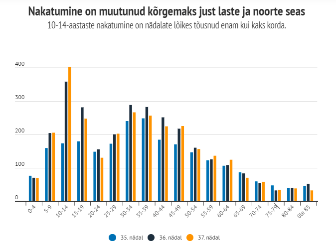 Из представленного Департаментом здоровья недельного обзора может создаться впечатление, что заболеваемость COVID-19 высока главным образом среди людей среднего возраста. На самом деле большой скачок заболеваемости произошел среди детей и молодежи.