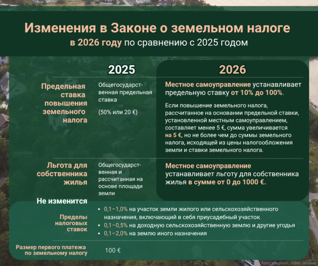 В 2026 году земельный налог для одной кадастровой единицы без учёта освобождений и льгот не увеличилась более чем на 10–100% по сравнению с 2025 годом. «Если местное самоуправление изменило условия предоставления льгот или если в новом году льгота на землю под жильём не применяется, сумма налога может увеличиться больше, чем предусмотрено предельной ставкой повышения», – уточнила Риита Парксепп
