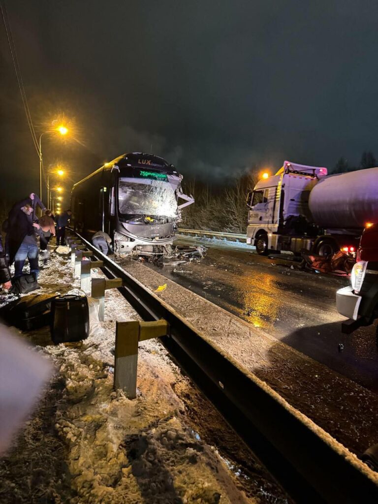 Вчера поздно вечером в Ленинградской области на трассе А-180 „Нарва“ возле Кингисеппа произошло столкновение пассажирского автобуса фирмы LuxExpress и грузовика.