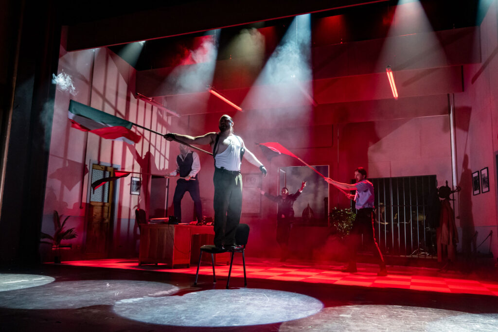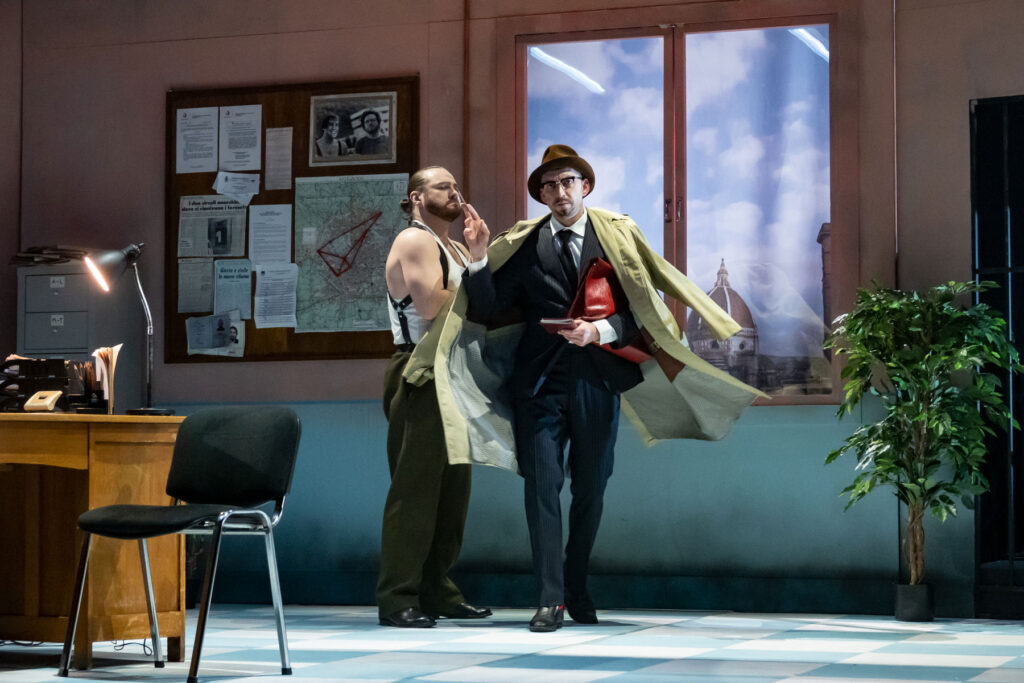 Спектакль поставил хорошо известный эстонскому зрителю режиссер Георгий Кутлис, чья постановка «Мудрец» по комедии А. Н. Островского идет третий сезон. В этот раз Кутлис создал музыкальный фарс, в центре которого – история безумного шута, игрока, лицедея, двойника (в главной роли – мастер перевоплощений Александр Жиленко). Сколько личностей может таиться в одном человеке? Но именно шут – единственный, кому позволено говорить правду. Роли незадачливых итальянских полицейских исполнили Дмитрий Кордас, Александр Домовой, Дмитрий Косяков и Илья Болотов. Единственную женскую роль в спектакле сыграла Марика Отса. Молодая активная журналистка, которая пытается докопаться до правды, совсем не так проста, как кажется…
