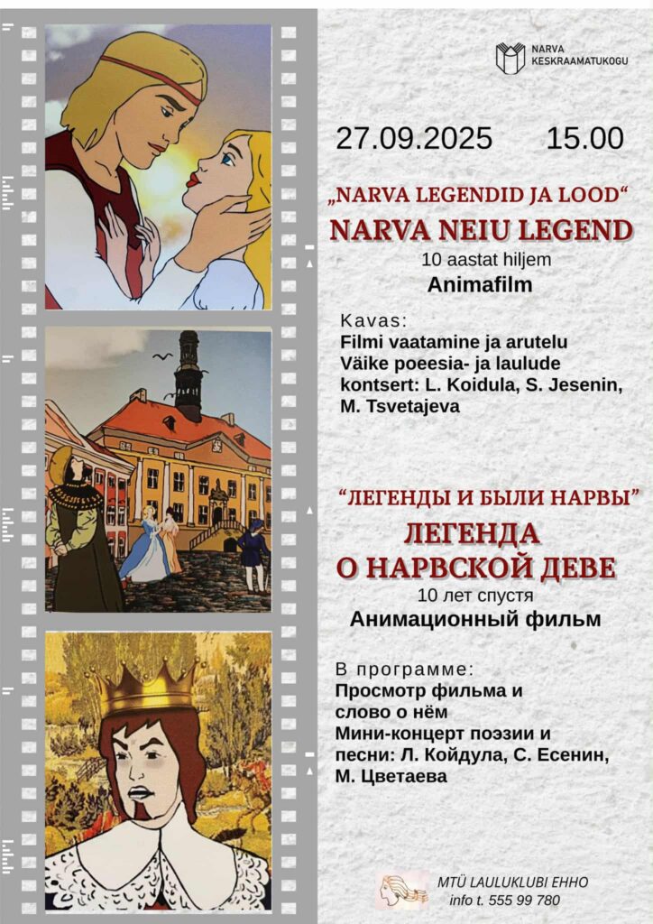 ЧТО? Легенда о Нарвской деве 10 лет спустя: просмотр анимационного фильма «Легенды и были Нарвы», мини-концерт поэзии и песни от клуба песни «Эхо». Бесплатно.