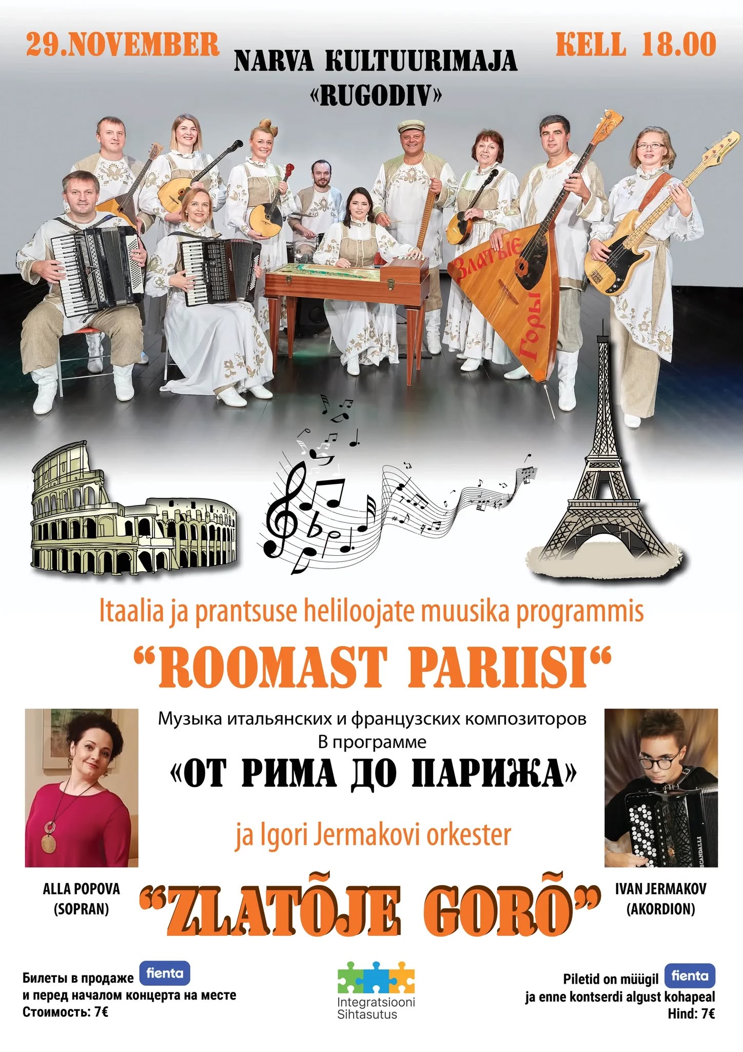 Алла Попова, сопрано, Иван Ермаков, баян. Оркестр народных инструментов “Златые горы” под управлением Игоря Ермакова. Билеты: 7 евро.