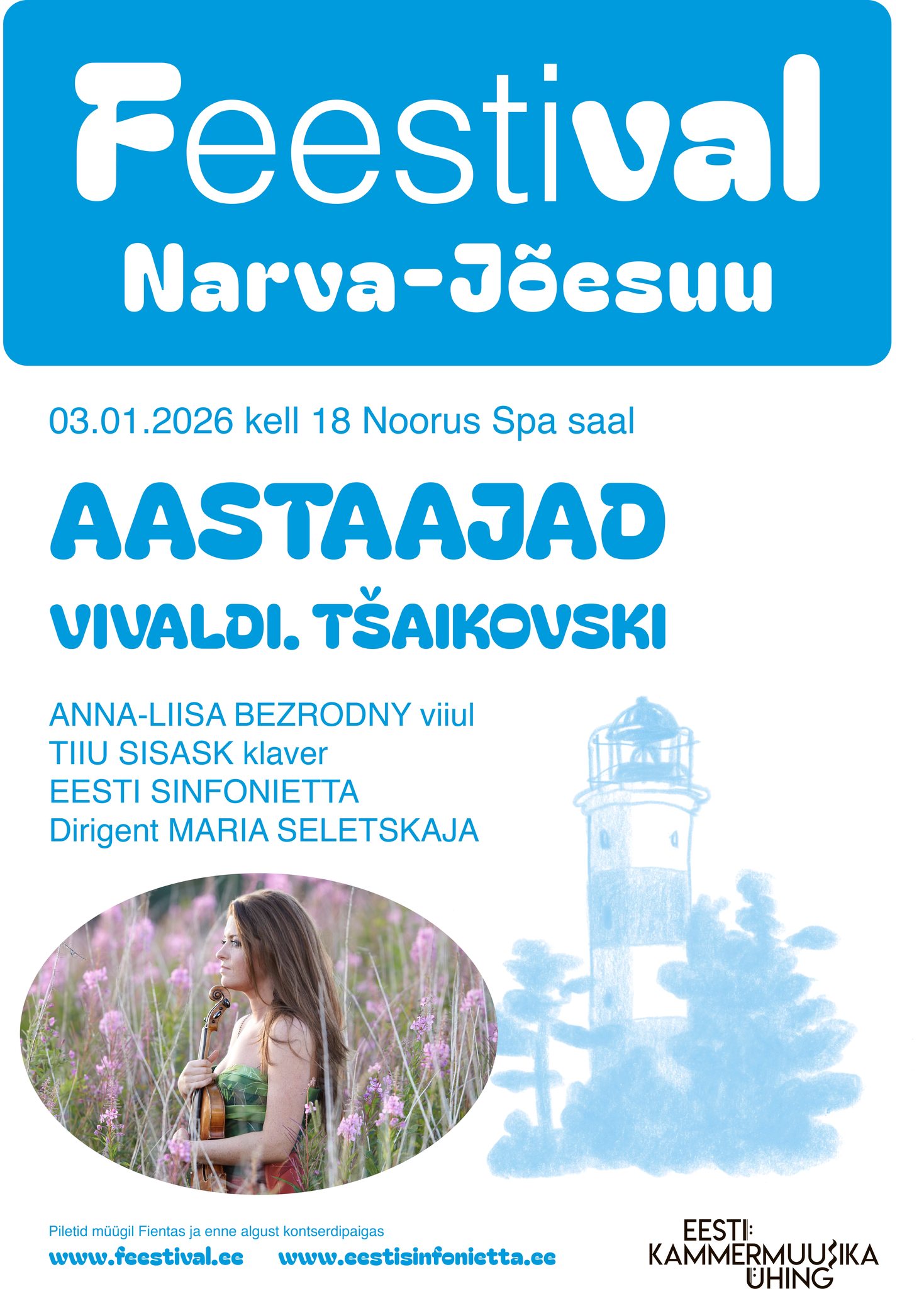 ЧТО? Фестиваль Narva-Jõesuu TULETORN 2026. Новогодний концерт Eesti Sinfonietta, дирижёр Мария Селецкая. В программе: скрипичные концерты Антонио Вивальди «Времена года» (солистка Anna-Liisa Bezrodny) и избранные пьесы из цикла Петра Чайковского «Времена года» (солистка Tiiu Sisask). Билеты: 7-10 €.