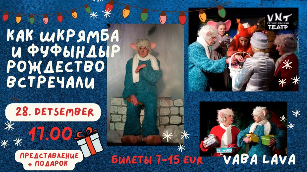 ЧТО? Спектакль Русского молодёжного театра «Как Шкрямба и Фуфындр Рождество встречали». Продолжительность: 1 час, 4+. Билеты 7-11 €, подарком — 15 €.