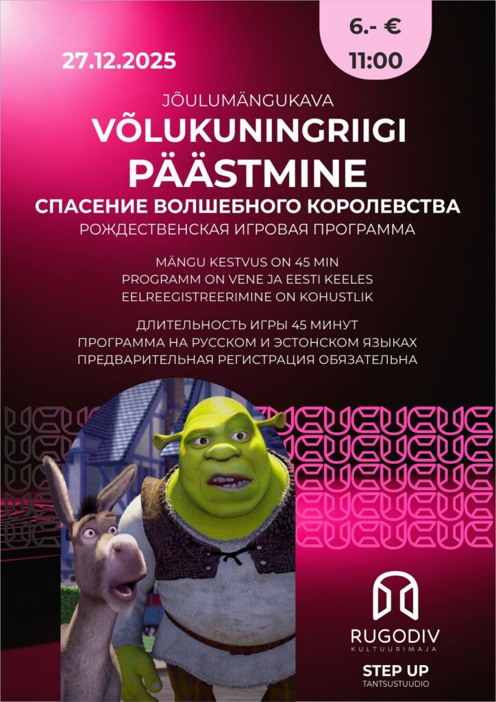 ЧТО? Рождественская игровая программа “Спасение волшебного королевства». 6-13+. Билет 6 €. Предварительная регистрация обязательна: kultuurispetsialist@rugodiv.ee .