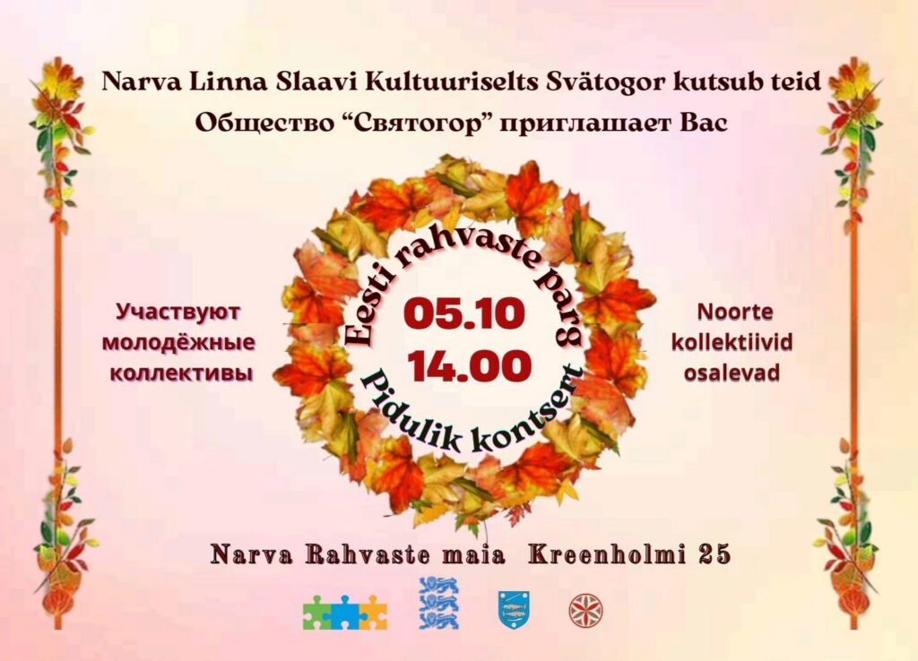 ЧТО? Нарва — осенняя столица Эстонии. Юбилейный музыкально-поэтический вечер Светланы Войтенко «Птица». Концертмейстеры: Екатерина Сергеева, Елена Петрищева. Поэтическая часть вечера станет сюрпризом, а песни, знакомые многим, исполнит гостья вечера — Андриана Чупова. Билет: 5 евро.