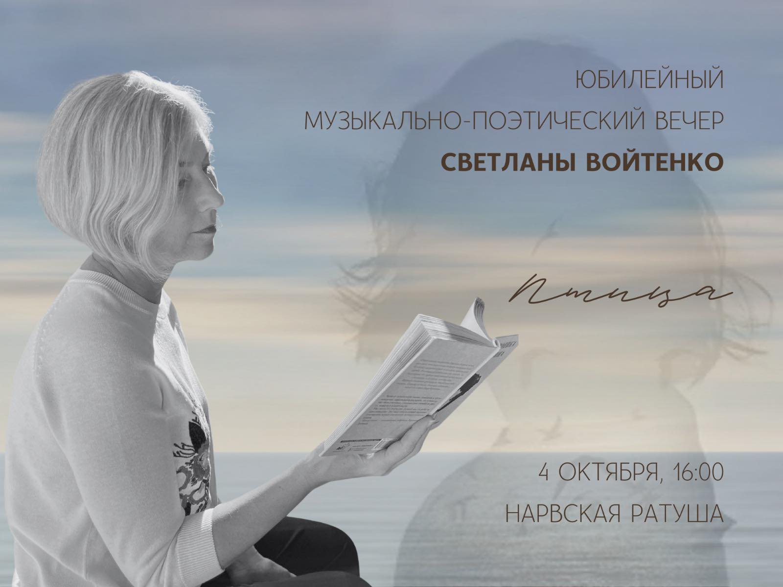 ЧТО? Нарва — осенняя столица Эстонии. Юбилейный музыкально-поэтический вечер Светланы Войтенко «Птица». Концертмейстеры: Екатерина Сергеева, Елена Петрищева. Поэтическая часть вечера станет сюрпризом, а песни, знакомые многим, исполнит гостья вечера — Андриана Чупова. Билет: 5 евро.