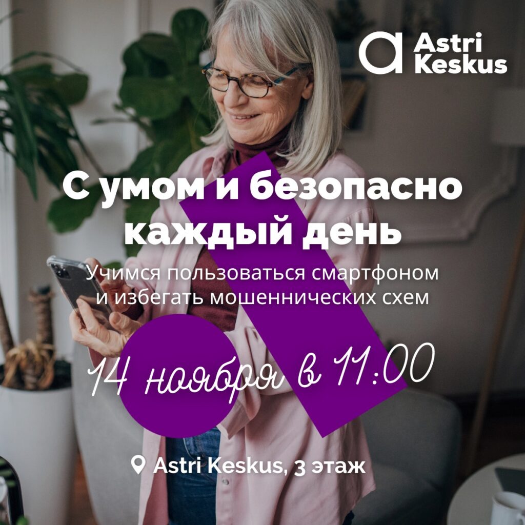 ЧТО? Встреча «Живи умно и безопасно!». Astri Keskus приглашает гостей старшего поколения поговорить об использовании смартфона и о том, как защитить себя от мошенников. Бесплатно.