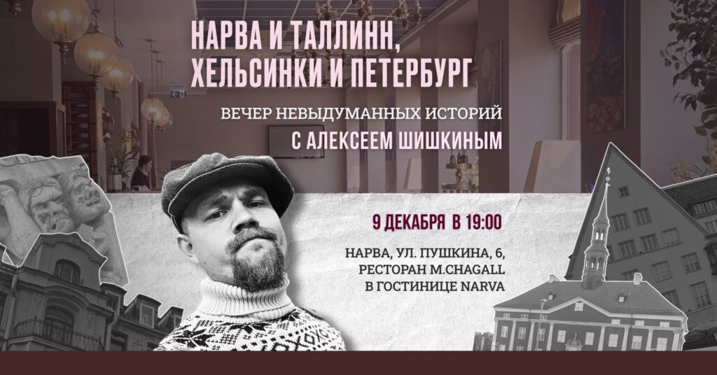 ЧТО? Вечер невыдуманных историй с журналистом и гидом Алексеем Шишкиным «Нарва, Таллинн, Хельсинки и Петербург». Билет 10 €.