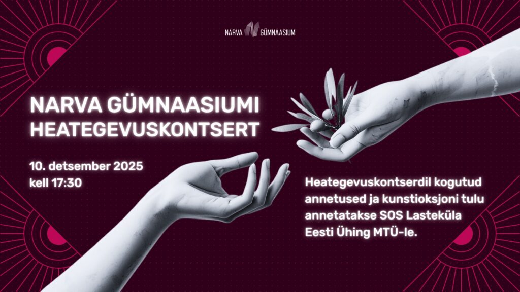 ЧТО? Благотворительный концерт учащихся Нарвской государственной гимназии. Пожертвования, собранные во время концерта, а также средства, полученные на арт-аукционе, будут переданы НКО SOS Lasteküla / “Детская деревня SOS”.