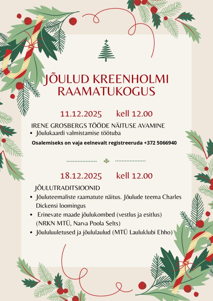 ЧТО? Открытие выставки работ Ирэне Гросбергс, выполненных в технике фьюзинг и мастер-класс по изготовлению рождественской открытки (участие по предварительной записи +372 5066940).