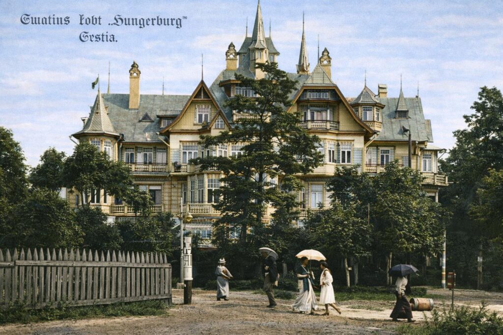 Напротив нашего дома, наискось, находилось общество трезвости Kalju. Сюда иногда приезжали немецкие актеры и давали для немецких солдат концерты. Актрисы носили шубы, сшитые из телячьих шкур, причем шкуры не были окрашены. Это были белые с черными пятнами, черные, рыжие, красно-коровьего цвета шубы. Вошли в моду фасоны с широкими плечами. Летом на ногах носили на деревянных подошвах сандалеты.