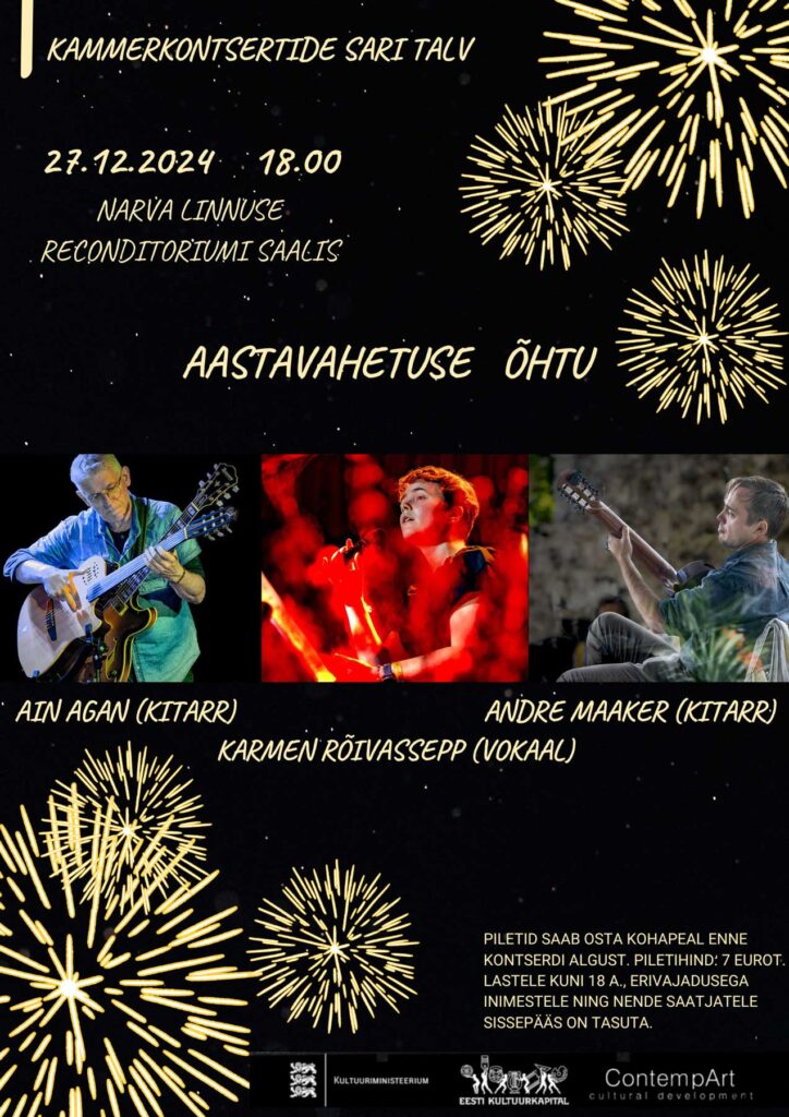 27 декабря в 18:00 в зале Нарвского музея «Рекондиториум» пройдёт очередной камерный концерт «Предновогодний вечер». Трио: Кармен Рыйвасепп (вокал), Андре Маакер (гитары), Айн Аган (гитары) исполнит оригинальные произведения, авторы которых — Аган, Рыйвасепп и Маакер, а также любимые произведения эстонских авторов и самые красивые рождественские песни.