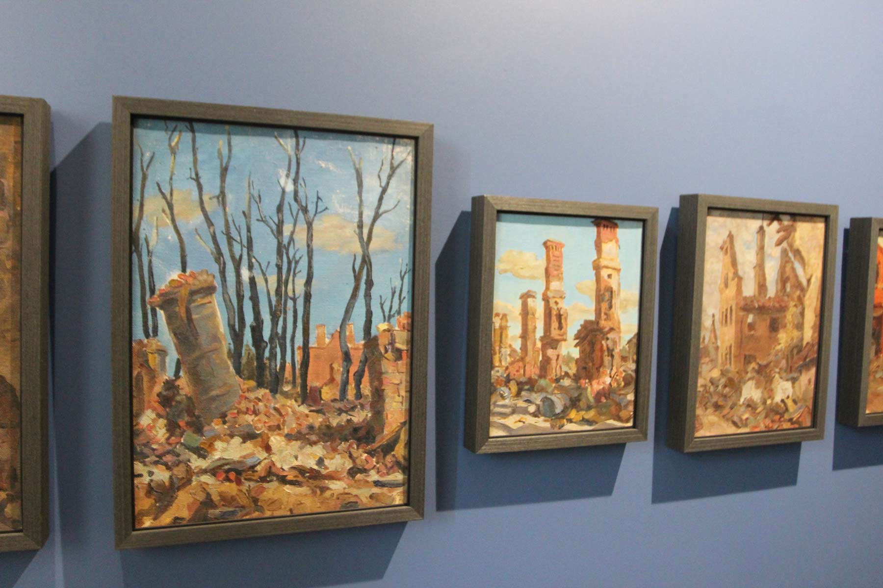 Постоянная экспозиция «Жизнь или карма? Нарвские истории» рассказывает историю города через произведения искусства — от «лица власти» с портретами XVIII века до «эха войны», где цвет живописи, как ни странно, передает утрату Старой Нарвы острее чёрно-белых фотографий. «Процентов семьдесят довоенной Нарвы было теоретически восстанавливаемо», — напоминает Анне, показывая на снимки разрушенных кварталов и на графику, где модернизация и индустриальные ритмы вдруг вступают в диалог с замком на фоне. В ящиках под стеклом — акварели, эстампы, узоры кренгольмских тканей — то, что иначе легко ускользает от взгляда.