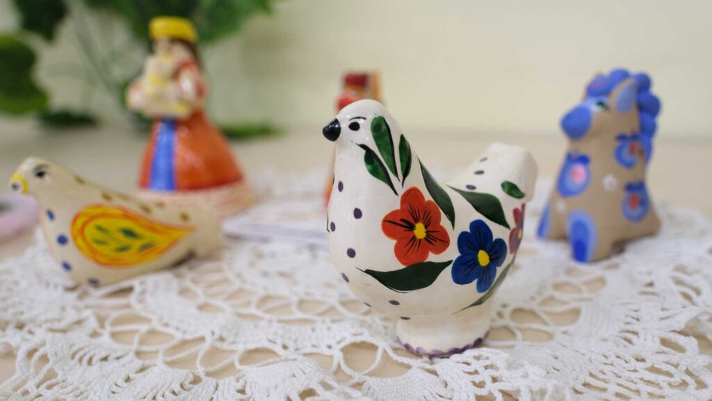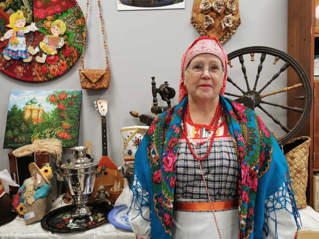 Экспонаты для обширной выставки собирались обществом в течение многих лет. Большая их часть- дымковская игрушка, берестовые изделия, финифть, павлопосадские платки, гжельская, жостовская, городецкая, мезенская роспись, хохлома, привезены из России, в частности, из Вологодской области, где у председателя НКО «Русичи» Евдокии Тевеленковой живут родственники и где она раньше часто бывала. Но есть и один экспонат из Эстонии – прялка.