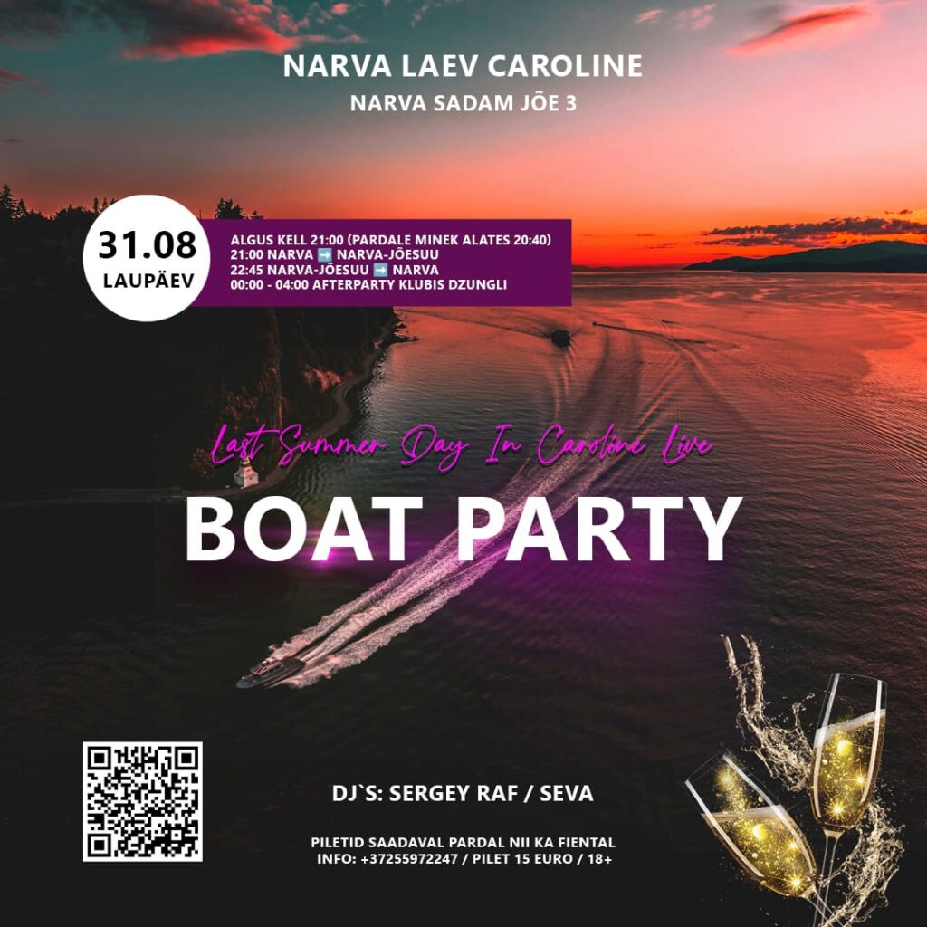 ЧТО? Дискотека на борту Caroline Boat party “goodbye summer”. В 23.00 отплытие из Нарва Йыэсуу в Нарву. Билеты: 15€. На сайте: fienta.ee или на месте в порту. 00:00-04:00 afterparty в клубе DZUNGLI. Вход в клуб DZUNGLI с билетом (печатью) бесплатно.