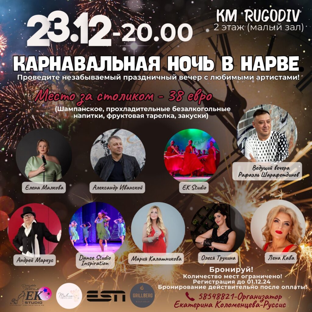ЧТО? Карнавальная ночь в Нарве. Место за столиком 38 евро (шампанское, напитки, тарелка с фруктами, закуски).