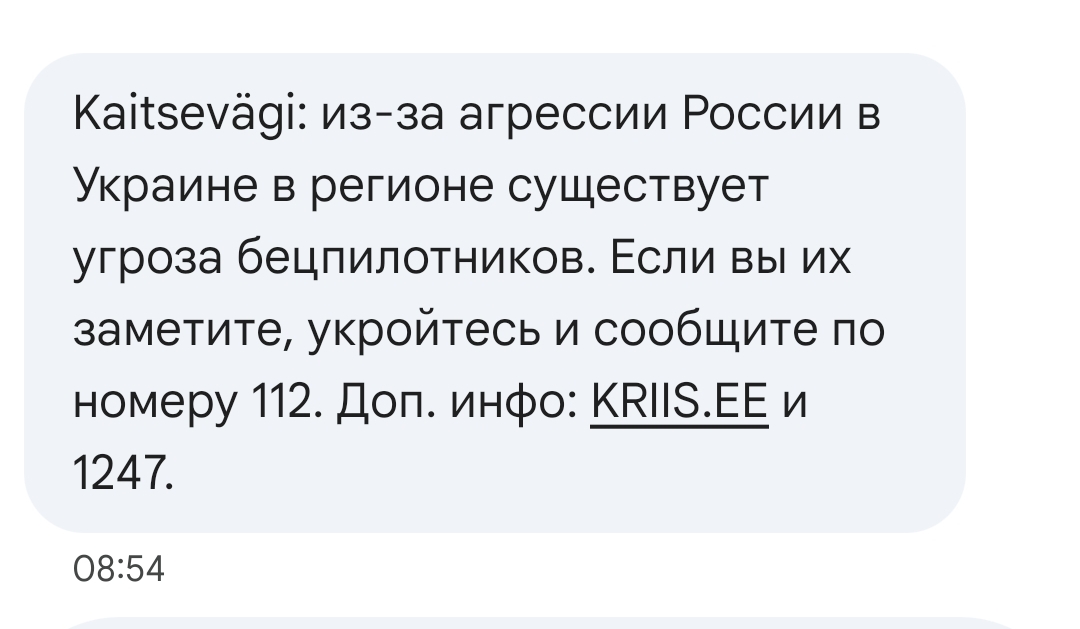Сообщения EE-ALARM необходимо воспринимать серьёзно. Если вы заметили дрон, следует немедленно укрыться. Лучшее место для укрытия — ближайшее помещение без окон. В условиях военной угрозы — подвал или другое помещение с прочными стенами. Читай больше здесь.