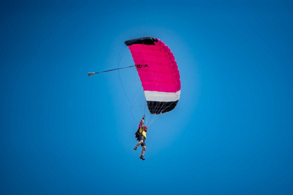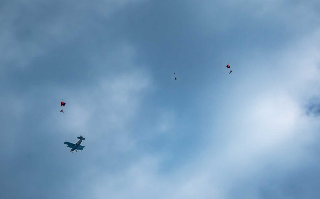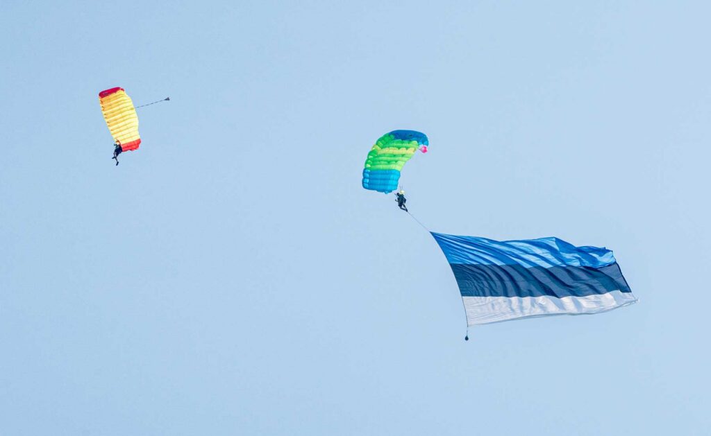 Важной частью шоу стали массовые парашютные прыжки. «Каждый из 20 парашютистов сделал от двух до четырёх прыжков. Один прыжок выполнили с самым большим флагом Эстонии (130 кв. м), другой — с дымами, демонстрируя отказ парашюта», — рассказывает инструктор по парашютному спорту Михаил Савосто. Огромный сине-чёрно-белый флаг под куполом вызвал у публики бурные аплодисменты. В другом прыжке экстремалы наглядно показали, как действует запасной парашют в случае отказа основного – зрелище не для слабонервных.