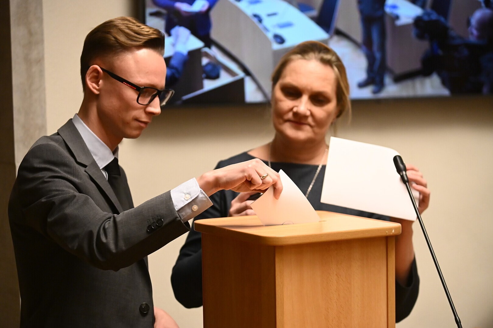 Денис Ларченко во время голосования в Нарвском городском собрании. Фото: Алексей Иванов