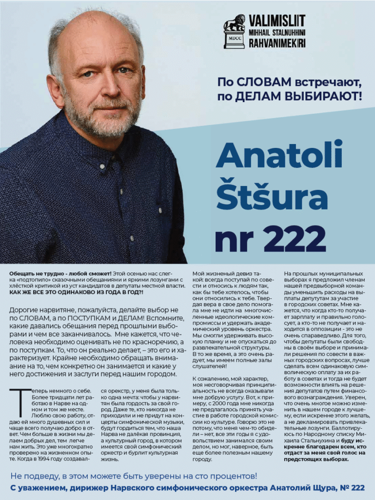 Дорогие нарвитяне, пожалуйста, делайте выбор не по СЛОВАМ, а по ПОСТУПКАМ и ДЕЛАМ! Вспомните, какие давались обещания перед прошлыми выборами и чем все заканчивалось. Мне кажется, что человека необходимо оценивать не по красноречию, а по поступкам. То, что он реально делает, – это его и характеризует.