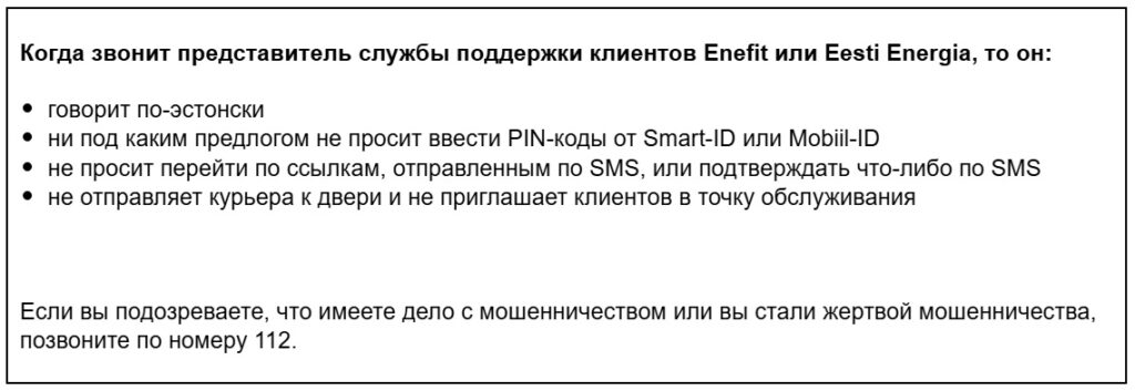 Санта Тохвер, руководитель эстонского рынка Enefit, отметила, что представители службы поддержки клиентов всегда говорят по-эстонски и ни при каких обстоятельствах не просят клиентов вводить PIN-коды от Smart-ID или Mobile-ID. «Enefit вообще не предлагает услугу замены электросчетчика, и необходимости в замене электросчетчика в связи с десинхронизацией от российской энергосистемы точно нет», – подтвердила она.