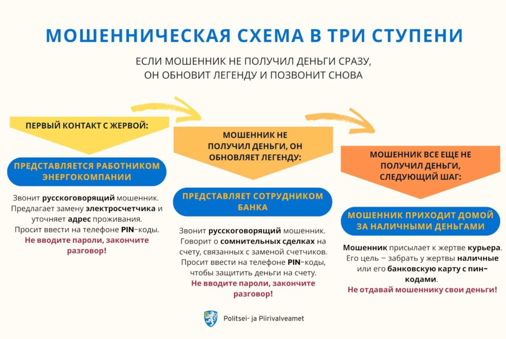В последнее время мошенники начали использовать такую схему для выманивания денег, когда они представляются сотрудниками Eesti Energia или Enefit, утверждая, что необходимо заменить счетчик электроэнергии, сообщает пресс-служба Департамента полиции и погранохраны. В то время как большинство людей бросают трубку, получив подозрительный звонок с просьбой сообщить PIN-коды или отправить деньги с курьером, одна женщина недавно стала жертвой этой схемы и передала более 17 000 евро преступникам, пришедшим к ее двери.