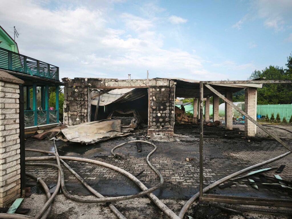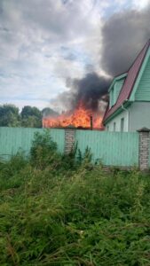 Пожар произошел около 4 часов вечера, приехавшая на вызов пожарная команда боролась с огнем несколько часов, в результате дом пострадал частично, но не критично. От хозпостройки однако остались только стены.
