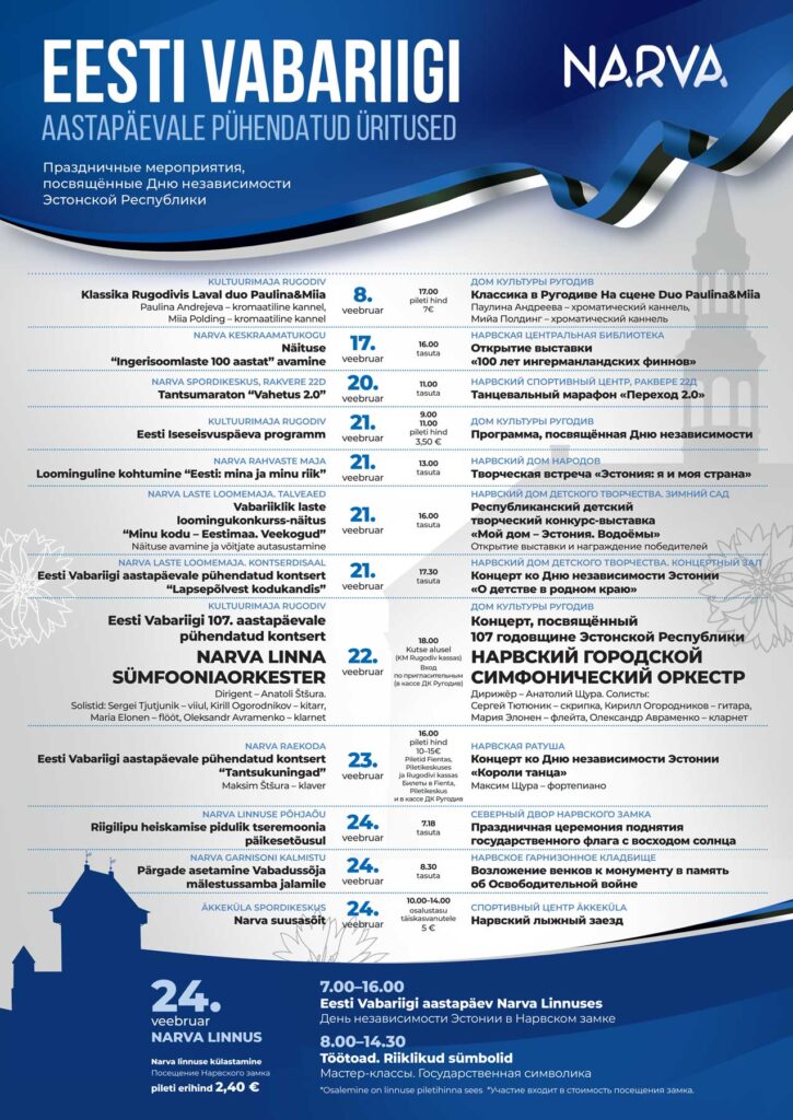 В этом году в Нарве подготовлена насыщенная программа мероприятий, посвященных Дню независимости. Приглашаем вас принять участие в торжествах: