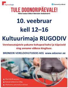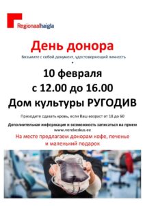 10 феврала в Доме культуры «Ругодив с 12:00 до 16:00 будет проходить День донора. Приглашаются постоянные и новые доноры. Каждая сдача крови — это реальный шанс спасти чью-то жизнь. Ваша кровь может помочь пострадавшим в авариях, пациентам после операций, онкобольным и детям.