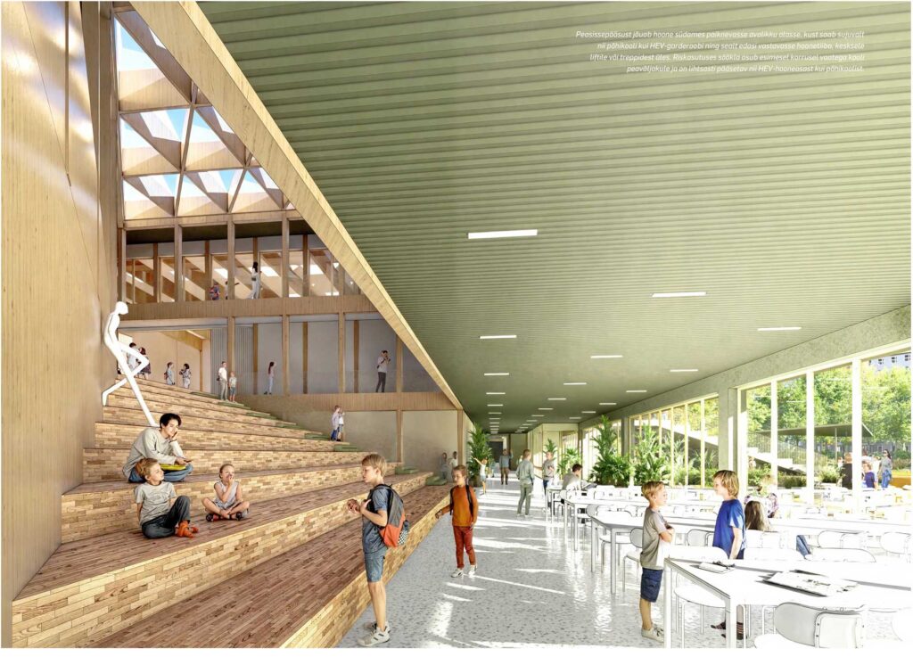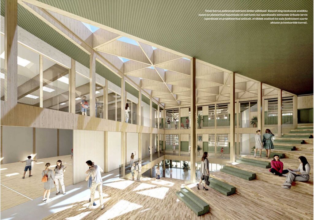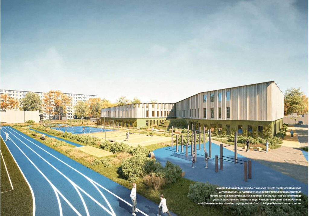 Спроектированное в общих чертах школьное здание, а точнее – комплекс из двух соединенных зданий, одно – для школы Паю, а второе – для Пяхклимяэской школы, в которую вольется 6 Школа, только на первый взгляд кажется массивным. В действительности его объем, общая площадь меньше, чем у остальных девяти представленных на конкурс проектов, но в то же время соответствует всем требованиям, ожиданиям жюри. Комплекс рассчитан на 800 учеников в целом.