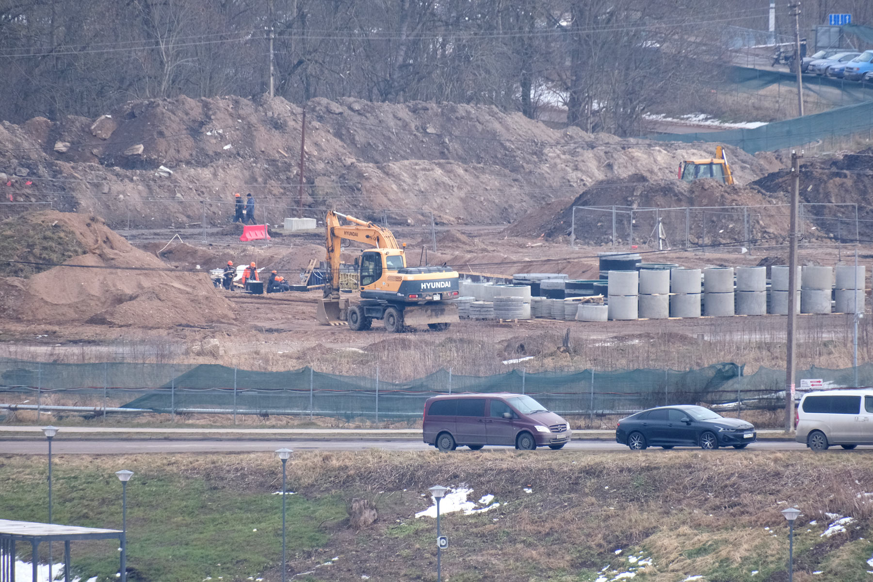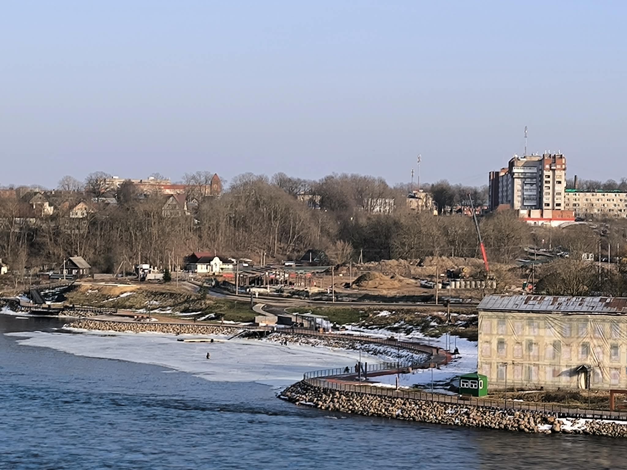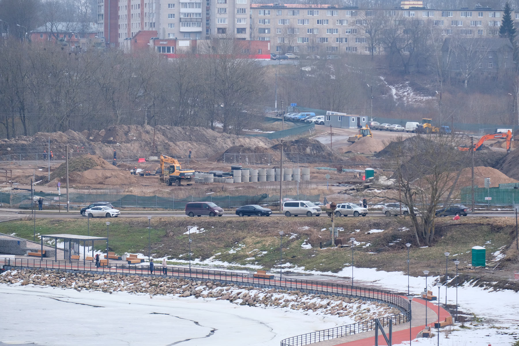 На снимках, сделанных вчера и сегодня, 11 и 12 марта, с нарвского берега, на площадке у ивангородского конца моста видна работающая техника, крупные насыпи грунта и кран. После нескольких месяцев, когда стройка почти не подавала признаков жизни, это заметная перемена.