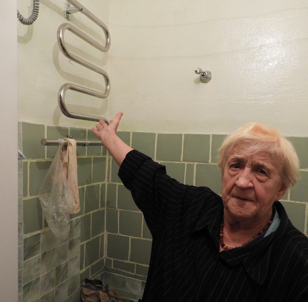 Идем с пожилой женщиной в ванную комнату. На стене вижу змеевик, но он электрический, включается в электророзетку. Конечно, купила его бабушка сама, как и второй обогреватель, который греет ее гостиную.