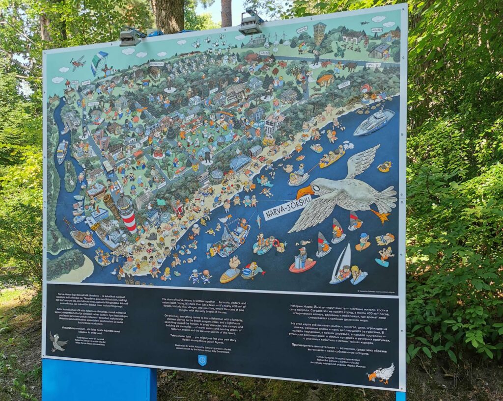 Мэр Нарва-Йыэсуу Максим Ильин пояснил, что речь идет о художественной карикатуре — интерактивной карте города, созданной художницей из Германии Натальей Щварц в прошлом году. Карта была согласована с чиновниками и уже широко используется как элемент городской символики. „Карту мы разместили, например, на календаре, который раздавали партнерам, друзьям горуправы, — отметил мэр. — Эти календари висят в учреждениях города, в школах в том числе, в кафе и ресторанах, в других самоуправлениях“.